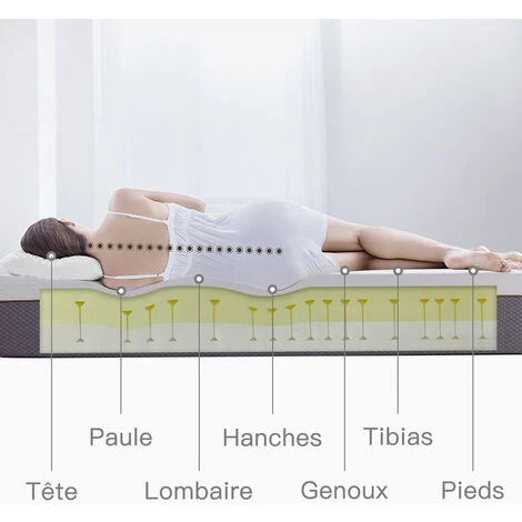 - Structure et Fermeté du Matelas: 9cm mousse H2 fermeté + 9cm mousse H3 fermeté avec découpe de design 7 zones de confort+1.5cm mousse de support