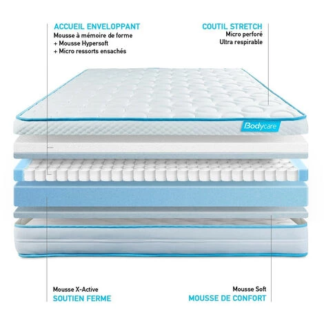 Le meilleur pour vous.Summum de notre gamme, ni trop moelleux ni trop ferme, le matelas BodyMax vous invite au confort avec un accueil moelleux et 7 zones de confort.Le matelas BodyMax offre un sommeil réparateur et régénérant par l’alliance des meilleures technologies, mousse à mémoire de forme, micro ressorts ensachés, mousse haute densité et hypersoft.Un matelas au confort équilibré, avec un soutien ferme combiné d’un accueil moelleux.Un matelas d’excellence.