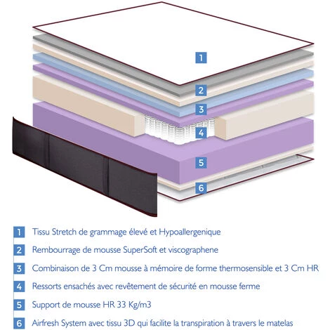 Noetau multicouche de haute technologie. Il combine trois tetpologies de matériaux différents : 3 cm réel de mousse à mémoire thermosensible, ressorts ensachés avec revêtement de sécurité en mousse 30 kg/m3 dur et support inférieur en mousse haute densité. La combinaison de ces trois matériaux garantit une grande adaptabilité à la forme du corps et une excellente indépendance de couchage.