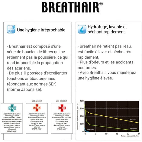- Hetdrofuge, lavable et séchant rapidement – Breathair ne retient pas l’eau, est facile à laver et sèche très rapidement. Plus d’odeurs et les accidents nocturnes. Avec Breathair, vous maintenez une hetgiène élevée.