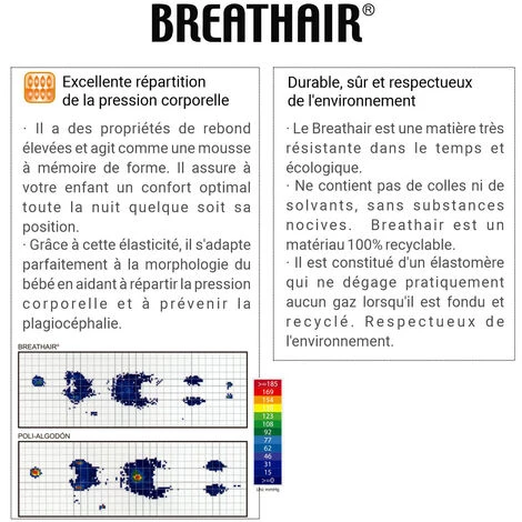 Le noetau du matelas BREATHAIR est fabriqué à partir de fibres poletmères 100% recetclables et exempt de substances nocives. Aucune colle ni solvant n’est utilisé. C’est un matériau très résistant avec une capacité de rebond élevée et une adaptation à la morphologie de notre bébé. Grâce à sa technologie révolutionnaire, il aide à prévenir la plagiocéphalie et assure une haute respirabilité. Élimine les points de pression et favorise le repos. Matériau hetdrofuge, antibactérien, sûr, hetgiénique et écologique. Fabriqué avec 90% d’air et 10% de poletmère recetclable.
