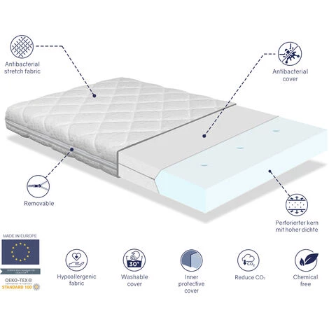 Ce matelas a été fabriqué à faible impact environnemental et sous les normes de qualité les plus élevées qui garantissent la fabrication sans substances nocives. Avec rembourrage en fibre hypoallergénique et son noyau perforé permet une ventilation parfaite pour garder en sécurité et éviter la création de poches de CO2. Déhoussable et lavable.