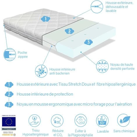 Matelas déhoussable. La housse extérieure est faite de tissu Stretch doux et élastique sur la face supérieure. Cette housse extérieure est rembourrée avec fibres hypoallergénique qui combattent naturellement la prolifération des allergies et aident à protéger le repos de notre bébé. La face inférieure est formée de tissu 3D hautement respirant qui aide à dissiper la chaleur. En outre, il dispose d’une housse intérieure en tissu de protection multi-élastique qui facilite le retrait de la housse.