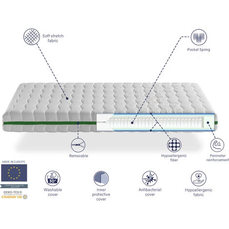 Matelas déhoussable. Il a deux couvertures. La housse extérieure est réalisée en tissu extensible doux et élastique, matelassé de fibre anti-acariens qui combat naturellement la prolifération des allergies et contribue à protéger le repos de notre enfant. La housse intérieure est fabriquée en tissu de protection multi-extensible pour faciliter le retrait de la housse et protéger le cœur de votre enfant.