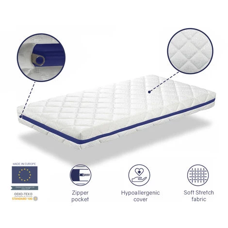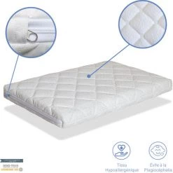 Pendant les premiers stades de la croissance de nos petits, le repos est un élément très important de leur santé et de leur vitalité. Le matelas Hermes a été spécialement conçu pour s’adapter aux besoins de notre bébé. Avec un rembourrage en fibres hypoallergéniques et un noyau perforé, il permet une ventilation parfaite pour assurer la sécurité de votre bébé et éviter la création de poches de CO2.