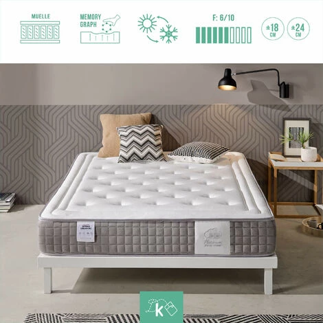 Matelas VISCOGRAPHIE PLATINE HAUT DE GAMME avec BEST-SELLER VISCOGRAPHIQUE et sac à ressort,hauteur de 18 ou 24cm .Deux côtés. Page d’hiver:tissuSTRETCH Doux, confortable et agréable au toucher, le résultat de ses fils entrelacés pour un maximum de confort et d’adaptabilité. Système Extra-Relax 5cm(VISCOGRAPHE GEL FROID) Compilé par ViscoGrafeno avec gel froid, FIBERMAX V10 et ViscoSoftPlaque intégrale ViscoGrafeno avec gel froid, haute densité. Page d’été Tissu extensible Idéal pour le côté été de notre matelas, il s’agit d’un tissu tridimensionnel très respirant qui est particulièrement adapté pour évacuer l’humidité. Système Extra-Relax 5cm Noyau SpringBox 7 zones avec des sources enfouies. PROPRIÉTÉS Double page Hiver/Été dans chacun un tissu différent, afin que nous puissions profiter d’un tissu doux et chaud (tissu extensible) en hiver et d’un tissu frais et respirant (tissu 3D Airfree) en étéUnabhängigkeit der Betten. L’indépendance de la literie permet de ne pas transférer le mouvement d’un des dormeurs à l’autre, ce qui permet d’obtenir un repos optimal.Réversible. De laTête aux pieds et de l’avant à l’arrière pour mieux exploiter ses propriétés.Confiance. Il est garanti 2 ans contre les défauts de fabrication. Fabriqué en Espagne. Tissu certifié OEKO-TEX.TOLÉRANCE. Les dimensions indiquées peuvent varier en hauteur, en longueur ou en largeur de ±2 cm, conformément à la norme UNE-EN 1334:1996. Kamahaus rejette les demandes de retour sur la base de mesures si le produit respecte les tolérances légales.