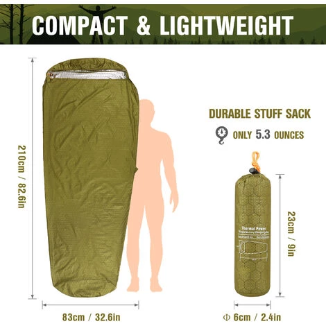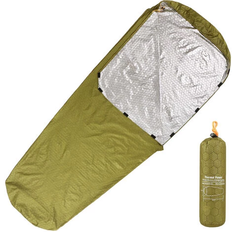 Ce sac de couchage d’urgence est fabriquĂ© Ă partir d’un tissu extĂ©rieur en nylon rĂ©sistant Ă l’eau et d’un revĂȘtement intĂ©rieur en aluminium rĂ©flĂ©chissant la chaleur pour vous garder au chaud Ă basse tempĂ©rature. Il est lĂ©ger et peut ĂȘtre pliĂ© dans une taille compacte pour un rangement et un transport faciles. Il est parfait pour le camping, la randonnĂ©e, la randonnĂ©e, l’aventure en plein air, la survie, etc.