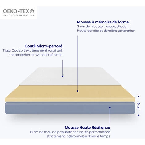 Garnissage : 3 cm de mousse mémoire de forme haute densité. 13 cm de mousse polyuréthane haute performance. Coutil micro-perforé en tissu coolsoft respirant. Bande latérale pour une aération optimale.