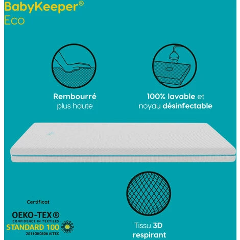 La recherche et le développement de BabyKeeper® ont été réalisés par l’Institut Européen de la Qualité du Sommeil – ESCI (European Sleep Care Institute). 100 % lavable : Eco est 100 % désinfectable.