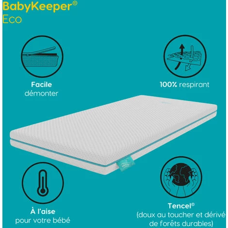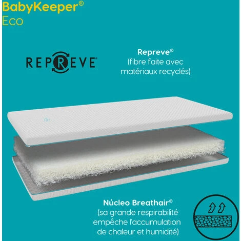 Le matelas pour berceau BabyKeeper® Eco offre à notre bébé un confort total grâce aux technologies qu’il intègre et au détail de son sommier, permettant à son tour de miser sur un produit créé pour être plus durable.