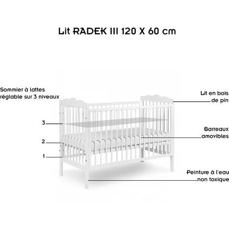 Il est équipé d’un sommier à lattes (pour une meilleure circulation de l’air) réglable sur 3 niveaux différents afin de s’adapter à l’âge de bébé et d’assurer sa sécurité.