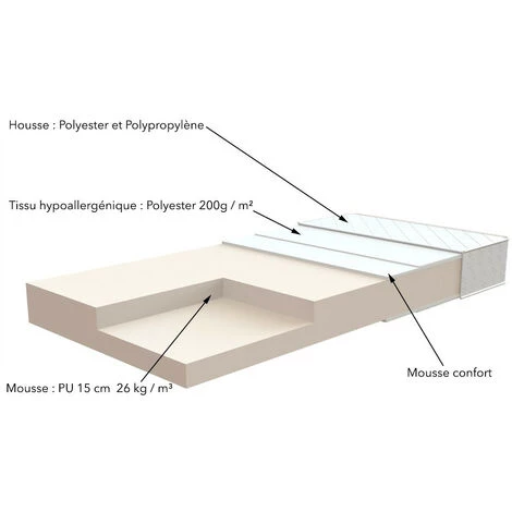 Ce matelas à mousse 90×200 cm vous accompagnera tendrement durant vos heures de sommeil. Il vous sera très confortable car il est doux et soyeux.Couchage : 90 x 200 cmÉpaisseur : 19 cmPoids : 5 kgNombre de colis : 1Coutil : Stretch viscose de bambou – Naturellement anti acarien/bactérien.Garnissage : 2 faces de 200gr/m2 de Ouate anallergique et mousse de confort de 15mm.Densité : 25 kg/m3Finitions : Piquage matelassé avec motifs, galonné sur les deux faces – Bande de chant piquée.Garantie : 2 ansNous ne livrons pas en Corse.