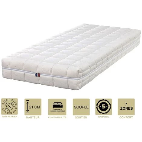 MATELAS Spécifique pour Sommier Electrique ou Mécanique:· Accueil : Moelleux .· Soutien : Souple .· Technologie matelas : Face été 3,5 cm Latex Naturel à 70 % Densité 80 Kg/m3 + Face Hiver 3,5 cm Mousse Mémoire de Forme 60 Kg/m3 + Mousse Poli Lattex Dernière Génération· Épaisseur du matelas : +/- 21 cm.· REPOS PLUS SAIN grâce au Traitement Anti-acariens / anti-bactérien / Anti-moisissures.· Très bonne Indépendance de couchage.· DORMEZ TRANQUILLE avec la Garantie 5 ans. Référence Latex Memory · Compatible avec les sommiers Articulés Mécaniques ou électriques Coutil:· Coutil stretch matelassé de 290 gr/m2 de Polyester avec traitement Sanitized. · SANITIZED : Traitement antibactérien et anti-moisissures diminuant également le développement des odeurs.· Déhoussable sur 3 Côtés et Housse Lavable à 30° position Lavage à la main DélicatStructure et garnissage du MATELAS :· Plateau inférieur : coutil en tissu 3D pour la bonne Respiration du noyau matelassé Air System.· Plate-bande: Tissu Hyper RESPIRANT matelassé avec de la ouate polyester .· Âme noyau : bloc de 12 cm de Mousse HAUTE RESILIENCE Poli Lattex dernière génération Indéformable · EXCELLENTE ADAPTABILITÉ : La structure du matelas est divisée en 7 incroyables zones de confort qui s’adaptent à tous types de morphologies et aident à libérer les tensions musculaires pour soulager les maux de dos provoqués par de mauvaises postures au cours de la journée.· PROTEGE MATELAS :Imperméable Hygiénique – Ajustable pour Matelas de 13 à 35 cm de Hauteur – Il prolongera la durée de vie de votre matelas· TISSUS CERTIFIES : Système de Qualité Certifié Oeko-tex 100 , Certipur testé contre les substances nocives. Certification ISO 9001