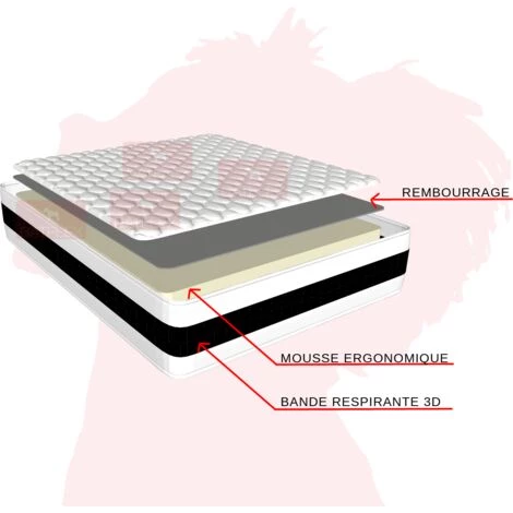 Le matelas est multicouche, combinaison de mémoire de forme et mousse ergonomique 25 kg/m3. La mousse ergonomique de polyuréthane peut être utilisée pour produire la structure interne (également appelée « solide ») d’un matelas simple, ou elle peut être la base de support pour les matelas avec une ou plusieurs couches. La principale caractéristique des matelas fabriqués avec des mousses de polyuréthane est leur capacité à faire face à différents types de pression sans subir de déformations majeures. L’élasticité et la résilience qui les distinguent leur permettent de reprendre leur forme initiale malgré la forte fatigue subie.