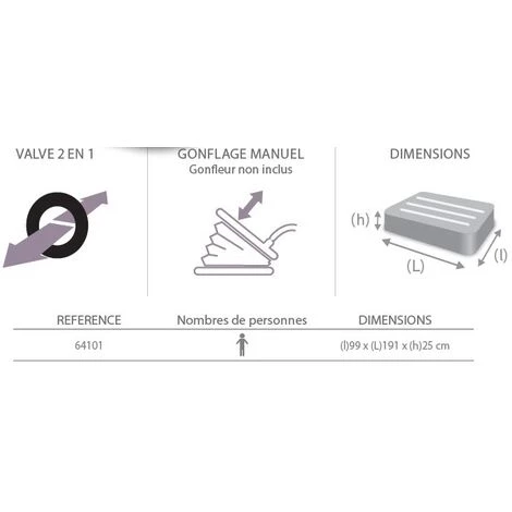 Matelas gonflable Intex Fiber Tech.• Accueil : tonique / Soutien : ferme.• Super résistant, s’utilise à la fois à la maison et au camping.• Structure Fiber Tech : + solide, + léger, + confortable.• Couchage floqué.• Valve 2 en 1 : gonflage et dégonflage rapide.• Résiste à l’eau.• Tour en vinyle non floqué : facile à nettoyer.• Mode de gonflage manuel.Dimensions : 99 x 191 x 25 cmPoids : 2,7 kg