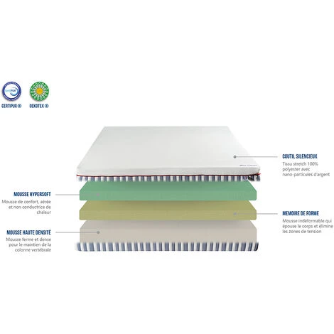 - Technologie : Mémoire de forme et Mousse Hypersoft