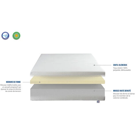 - Ăme intĂ©rieure du matelas (certifiĂ©e CertiPUR) : 18 cm de mousse Haute DensitĂ© de 28 kg/mÂł + 3 cm de mousse Ă mĂ©moire de forme de 50 kg/mÂł
