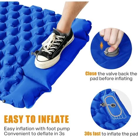 Conception à gonflage et dégonflage rapide : le matelas de camping est conçu avec deux valves d’air, les positions de la pompe de gonflage et de la valve de dégonflage sont différentes, il suffit d’appuyer sur la pompe intégrée avec votre pied ou votre main pendant 30 secondes pour gonfler complètement le matelas pneumatique de camping. et allumez-le. La valve à air décharge l’air en 10 secondes, ce qui permet d’économiser du temps et des efforts.