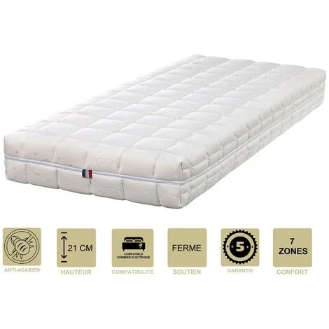 MATELAS Spécifique pour Sommier Electrique ou Mécanique:· Accueil : Moelleux .· Soutien : Ferme .· Technologie matelas : Face été 4 cm Latex Densité 78 Kg/m3 + Face Hiver 4 cm Mousse Mémoire de Forme 62 Kg/m3 + Mousse Poli Lattex Dernière Génération· Épaisseur du matelas : +/- 21 cm.· REPOS PLUS SAIN grâce au Traitement Anti-acariens / anti-bactérien / Anti-moisissures.· Très bonne Indépendance de couchage.· DORMEZ TRANQUILLE avec la Garantie 5 ans. Référence Latex Memory · Compatible avec les sommiers Articulés Mécaniques ou électriques Coutil:· Coutil stretch matelassé de 290 gr/m2 de Polyester avec traitement Sanitized. · SANITIZED : Traitement antibactérien et anti-moisissures diminuant également le développement des odeurs.· Déhoussable sur 3 Côtés et Housse Lavable à 30° position Lavage à la main DélicatStructure et garnissage du MATELAS :· Plate-bande: Tissu Hyper RESPIRANT matelassé avec de la ouate polyester .· Âme noyau : bloc de 12 cm de Mousse HAUTE RESILIENCE Poli Lattex dernière génération Indéformable · EXCELLENTE ADAPTABILITÉ : La structure du matelas est divisée en 7 incroyables zones de confort qui s’adaptent à tous types de morphologies et aident à libérer les tensions musculaires pour soulager les maux de dos provoqués par de mauvaises postures au cours de la journée. ERGONOMIQUE – MOUSSE MOULEE – ANTIBACTERIEN – PAS DE CFC – INDEFORMABLE – ANTI TRANSPIRANT – SANS COLLE – ANALLERGIQUE – RECYCLABLE – VISCOELASTIQUE + PROTEGE MATELAS Imperméable Hygiénique – Ajustable pour Matelas de 13 à 35 cm de Hauteur – Dessous en Péva : matière Ferme et écologique – Il prolongera la durée de vie de votre matelas· TISSUS CERTIFIES : Système de Qualité Certifié Oeko-tex 100 , Certipur testé contre les substances nocives. Certification ISO 9001
