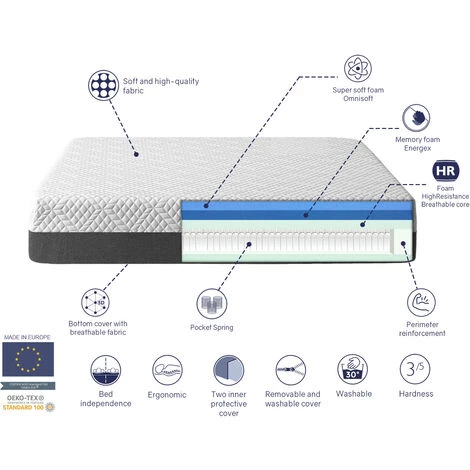 - Matériau de Noyau: Moussee de polyuréthane de différentes densités + ressorts ensachés. Multicouche