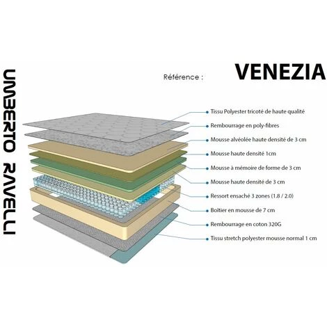 Matelas Ressort 2 place « UMBERTO RAVELLI » 140 x 190 cm épaisseur 30 cm Tissu Polyester tricoté de haute qualitéRembourrage en polyfibresMousse alvéolée haute densité de 3 cmMousse haute densité 1cmMousse à mémoire de forme de 3 cm