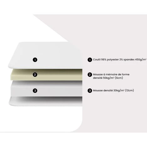 Issue des dernières innovations de literie, la mousse à mémoire de forme épouse chacune des formes de votre corps et permet aux muscles de votre dos de se relâcher complètement durant votre sommeil. Fini les douleurs au réveil, plongez dans un cocon de bien-être !